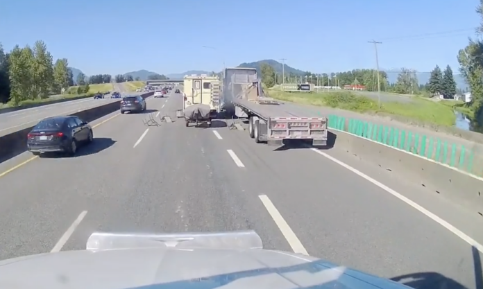 In the clip, the filming driver is traveling behind a camper that suddenly slows and maneuvers around some obstacles before pulling in front of a flatbed already stopped in the right lane. As the camper drives away, the filming trucker realizes that a set of patio chairs has been left all over the road and quickly alerts oncoming drivers of the issue on his CB.